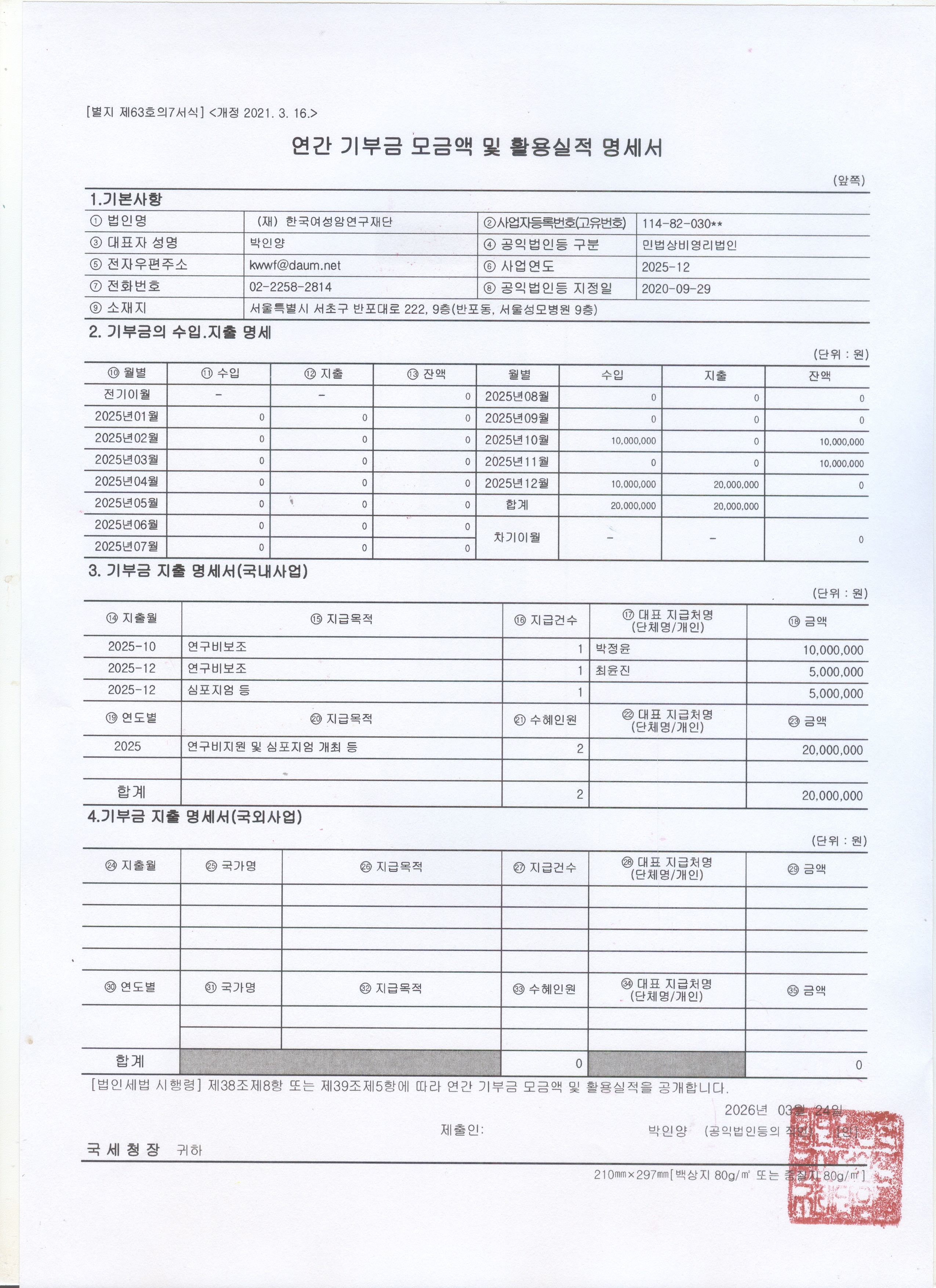 2025년 연간 기부금 모금액 및 활용실적 명세서